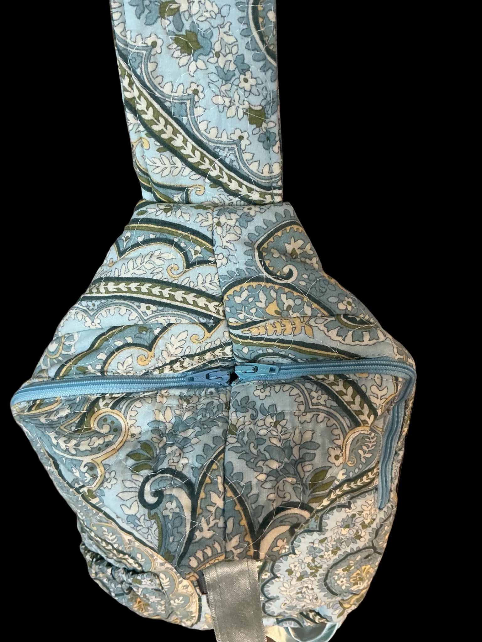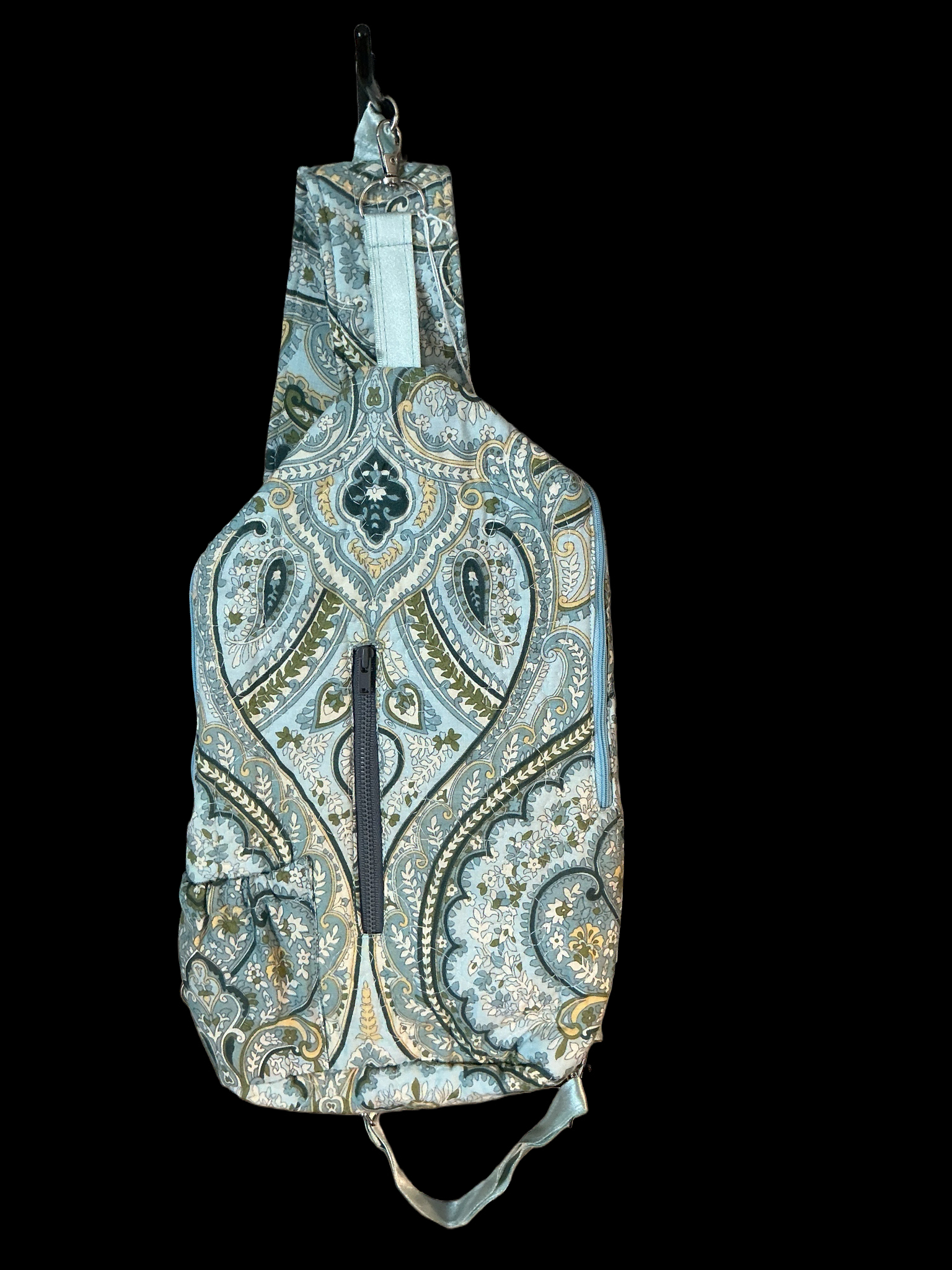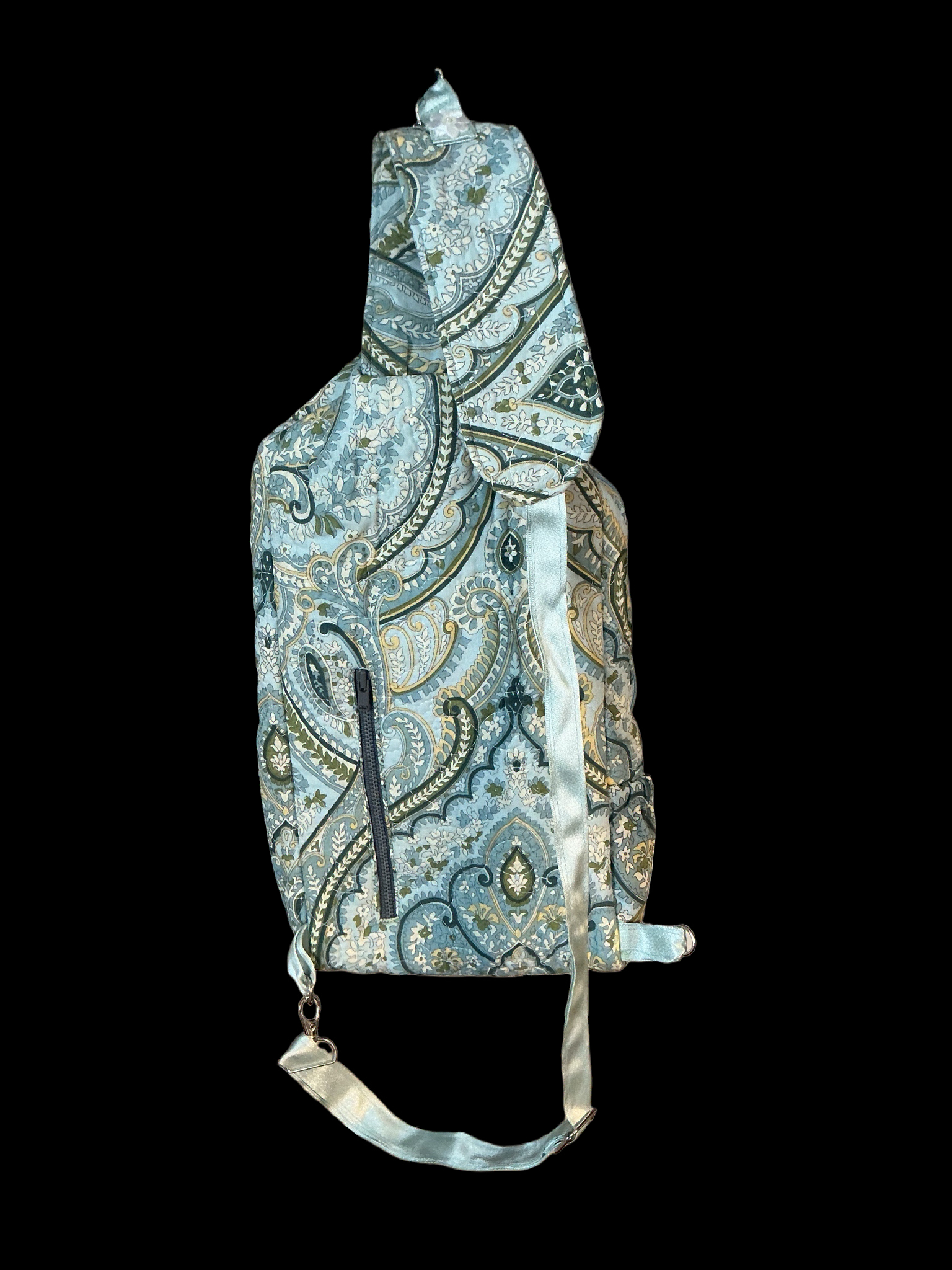 One of a kind, handmade, quilted crossbody bag with adjustable strap features two outside zippered pockets, one elasticized phone pocket and large, lined interior space perfect for holding a wallet, brush, etc. Strap is adjustable and can be worn left or right across the body. Bag is crafted from a sourced pillow sham and is machine washable.