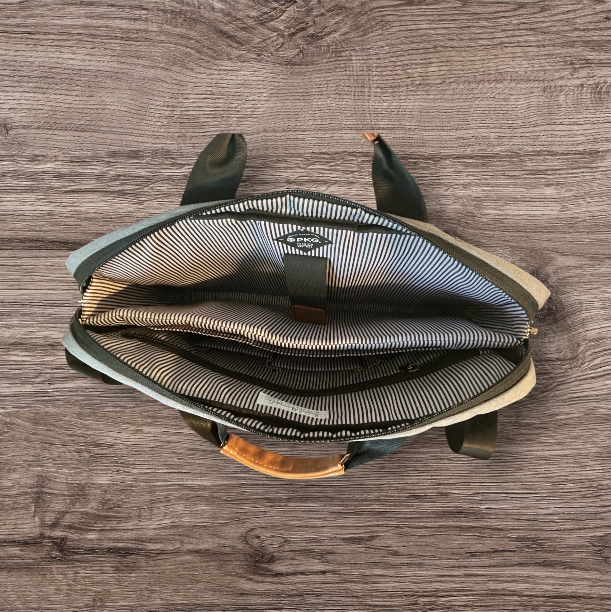 Who says a computer bag can’t be serviceable and feminine too. This 16”W x 13”T x 2.5”D gray computer bag features a heavy duty carry strap with shoulder pad, padded computer compartment with a Velcro strap closure, three outside zippered pockets, one inside zipper pocket and two slip in pockets as well as a pen pocket. Embellishments are attached by hand and will hold up to heavy use. Spot clean with water and mild soap.